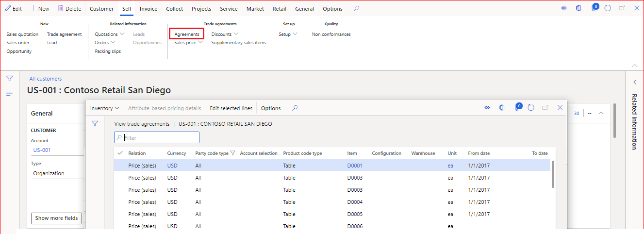 Go to all Customers > Select a customer > Click on Sell tab > Field group 'Trade agreements' > Click on 'Agreements'